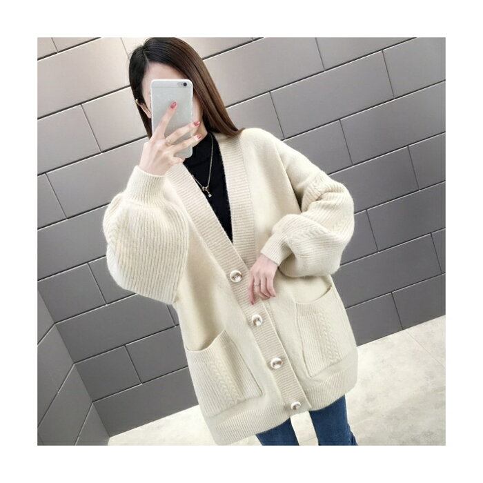 送料無料&即納★ バルーンスリーブ Vネック リブ ニット ロング カーディガン 上品 長袖 ボリューム袖 / レディース バルーン セーター ゆったり パフ袖 清楚 オフィスカジュアル カジュアル 大きいサイズ 白 茶色 緑 ピンク ホワイト ベージュ グリーン 冬 秋 春