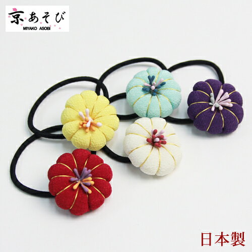 京あそび 日本製 ちりめんぷっくり花ヘアゴム髪飾り 卒業式 袴 成人式 結婚式 振袖 ヘアゴム 大人っぽい シンプル おしゃれ ヘアアクセサリー 花 和装 レトロ ブライダル 赤 白 紫 黄色 水色 MIYAKO ASOBI