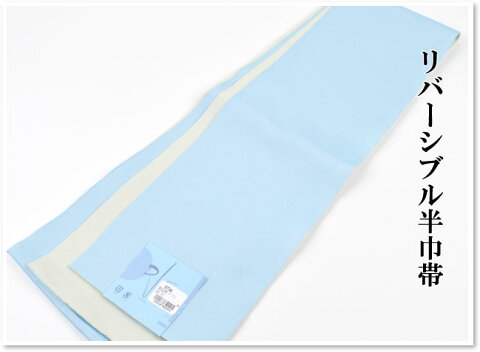 1点までメール便OK 浴衣帯 リバーシブル 無地 半巾帯 袴下帯 ロング 水色/アイボリー